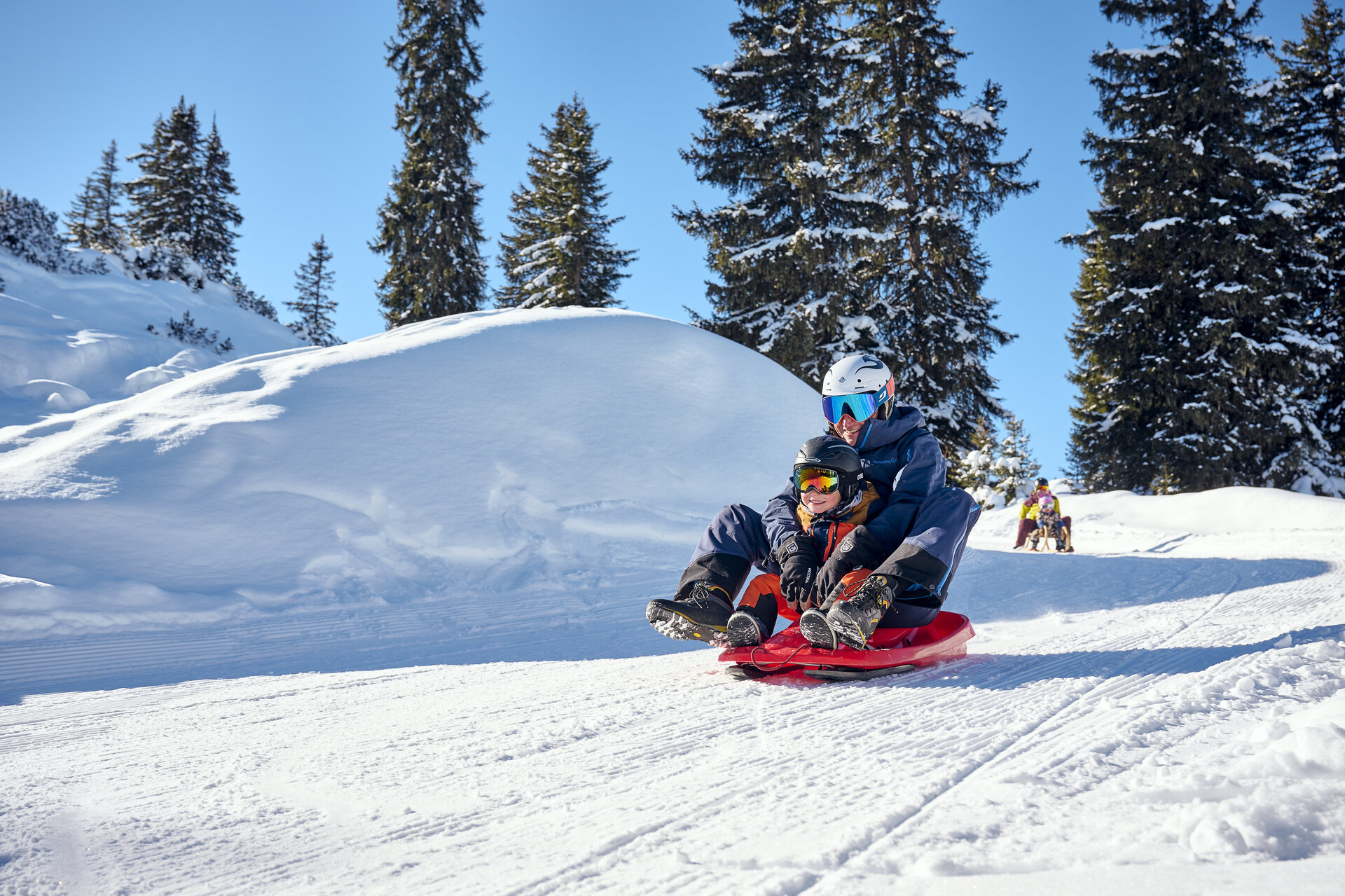 Gestärkt und voller Tatendrang beschließen wir, den Nachmittag mit einer Rodelpartie zu krönen. Die 2 km lange Rodelbahn, die sich von der Berg- bis zur Mittelstation schlängelt, wartet bereits auf uns. Ausgestattet mit Rodel und Bob sausen wir lachend die Bahn hinunter. Unten angekommen führt uns die Gondel erneut hinauf zur Bergstation – bereit für die nächste Abfahrt.