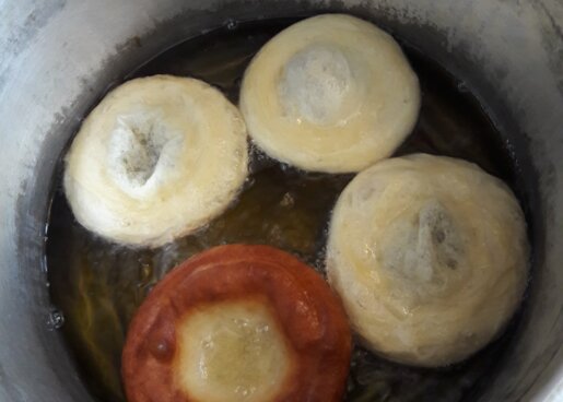 - Den Teig nochmals etwas rasten lassen. Währenddessen das Fett erhitzen.