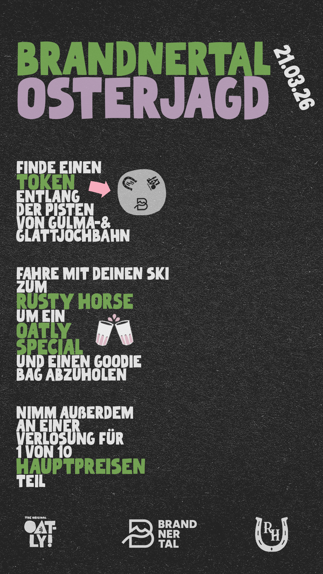 Am 21. März wird Dein Skitag im Brandnertal zur kleinen Osterjagd. Entlang der Pisten der Gulma- und Glattjochbahn sind Tokens versteckt – wer einen findet, darf sich beim Rusty Horse eine Überraschung abholen.
