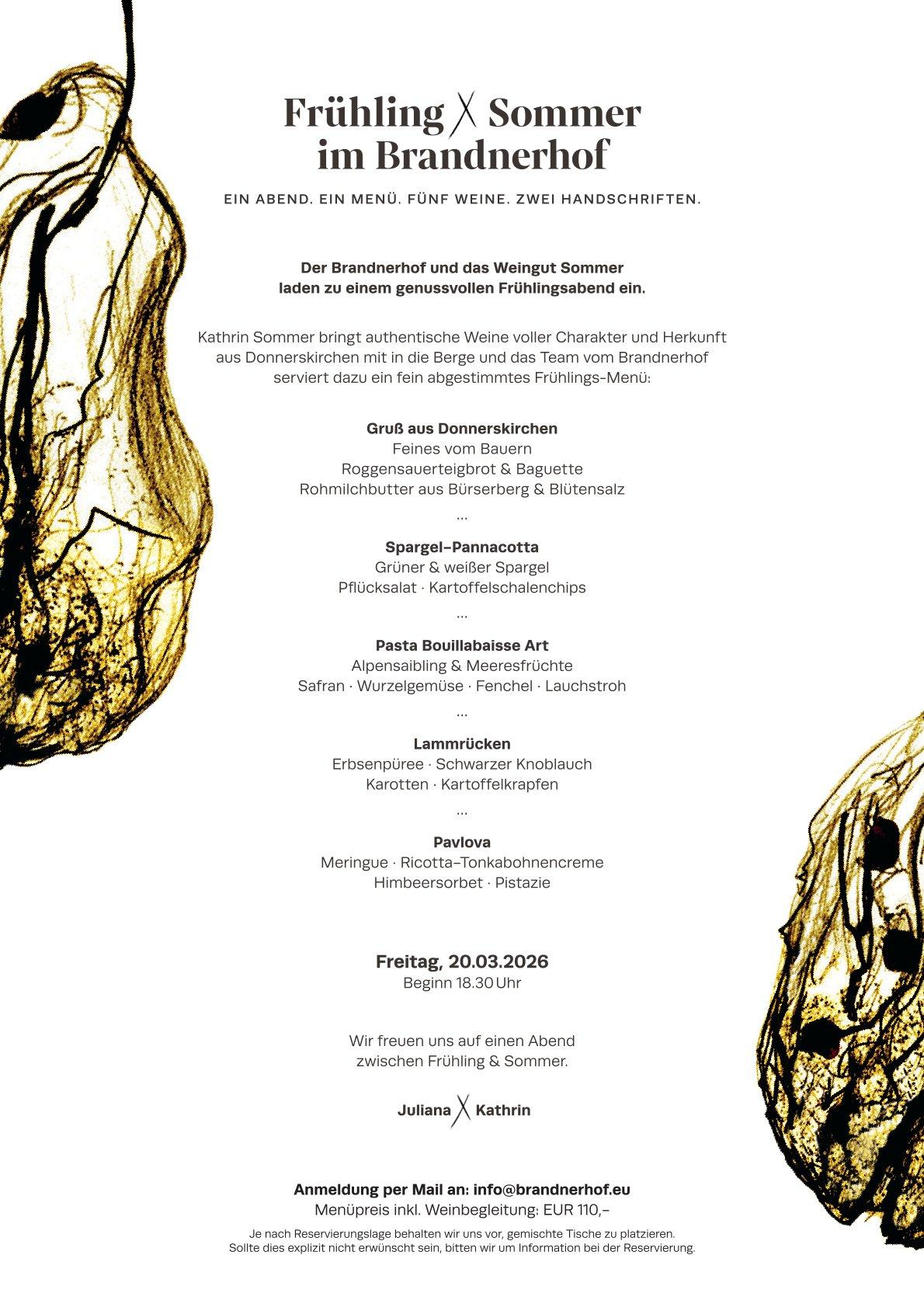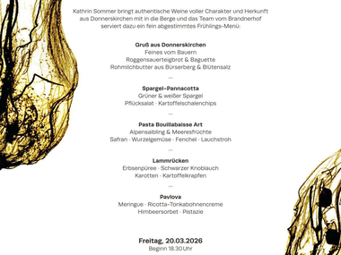 Kathrin Sommer vom Weingut Sommer bringt authentische Weine voller Charakter und Herkunft aus Donnerskirchen mit in die Berge. Dazu serviert das Brandnerhof-Team ein fein abgestimmtes Frühlingsmenü. Kathrin wird die Weine aus ihrem Top-Segment persönlich präsentieren.