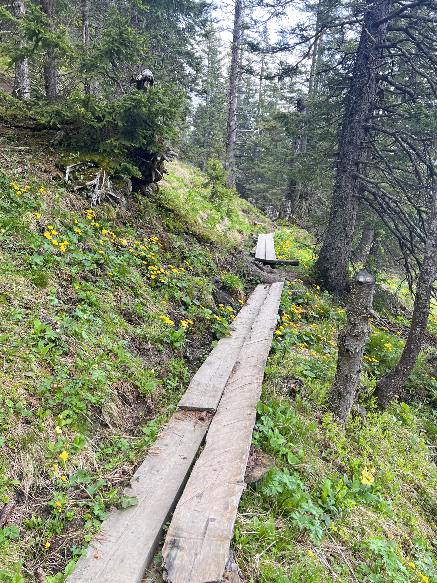 After Rufana Alp, the trail branches off to the right at the barrier and leads uphill through a very beautiful section of forest. After the Schesatobel view point, the trail leads along old walls and over boardwalks up to the Bürser Skihütte (ski hut), where you cross the main road and follow the hiking trail next to the BERGRESTAURANT FUCHSBAU in the direction of the Loischkopfbahn middle station. Before you get there, follow the path in the direction of the Burtschasattel.