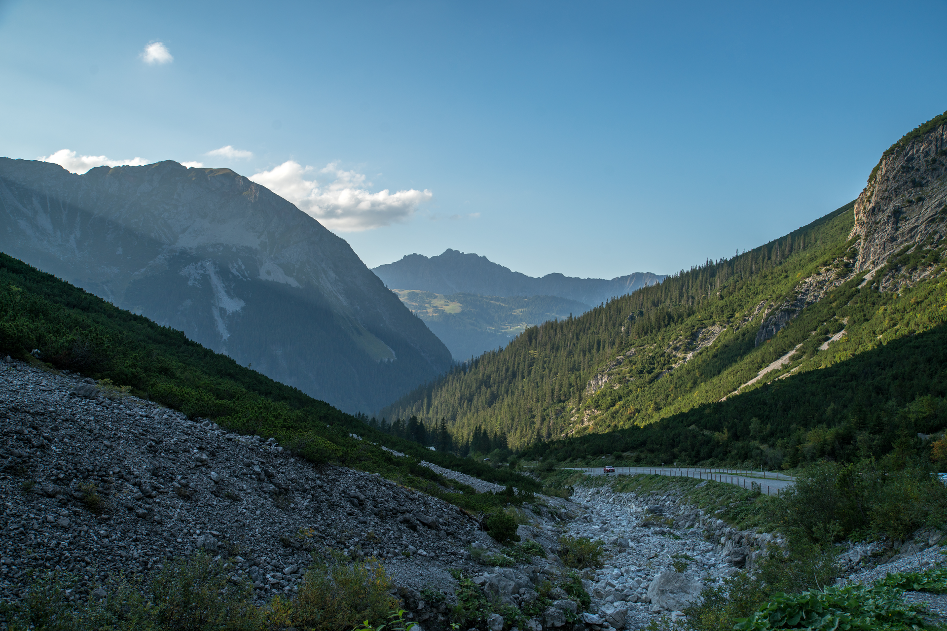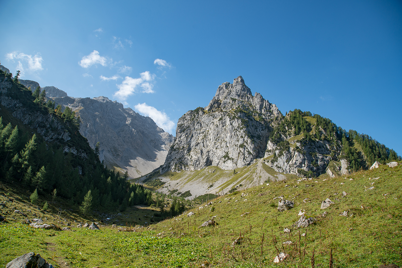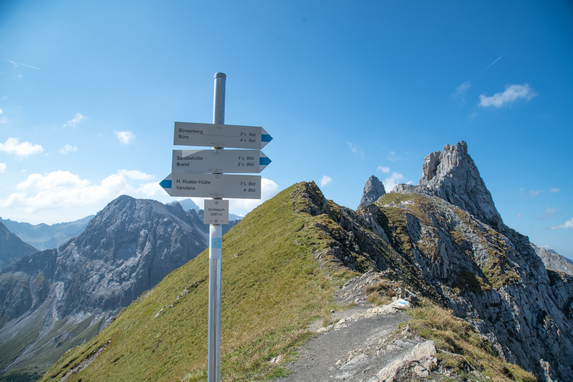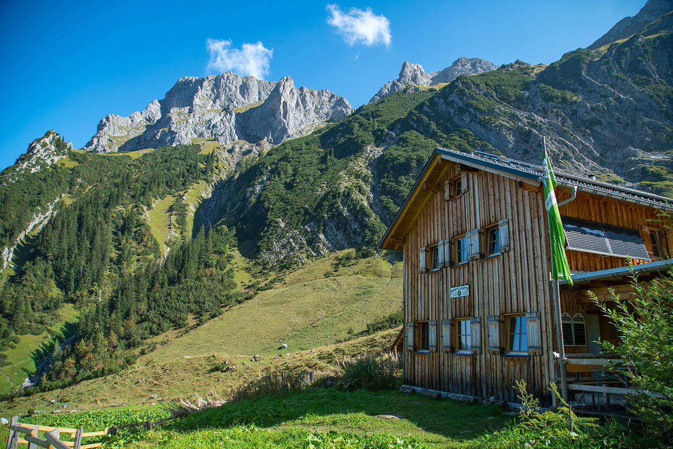This mountain tour starts in the center of Brand. Here you hike along the Alvierbach stream out of the valley until the trail branches off into the Sarotla valley. The beautiful hiking trail leads along the stream in several serpentines up to the Sarotlahütte. Passing the Sarotlahütte, this mountain hike now leads on level ground for a short while and then over rocky terrain in several serpentines up to the Zimbajoch (2,387 m).