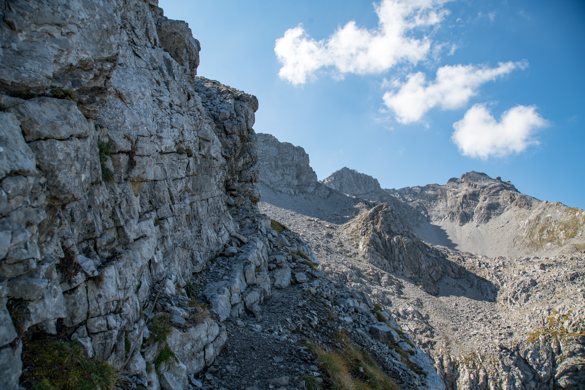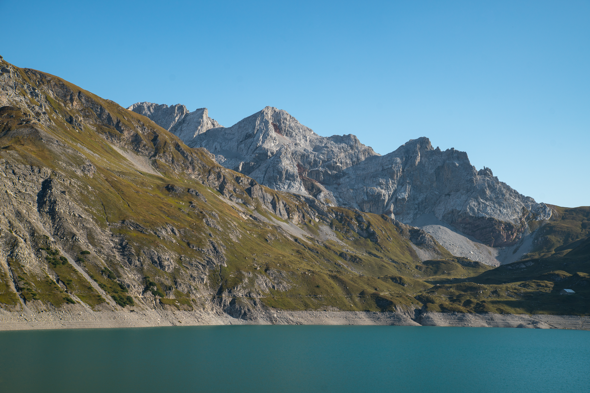 On the other side, a very steep zig-zag path also in rocky terrain leads down to the Heinrich-Hueter hut. After a short rest at the Heinrich-Hueter hut, the trail then leads via the Gipsköpfleweg below the Schafgafall up to the Lünerkrinne. From the Lünerkrinne, the trail now descends to the Lünersee and continues along the Lünersee circular trail to the Douglasshütte.