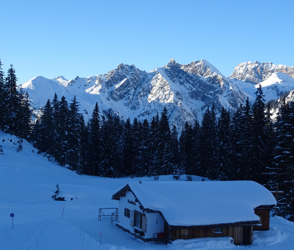 Die Bündthütte mit gemütlicher Sonnenterrasse befindet sich direkt an der Talabfahrt (Piste 1).
