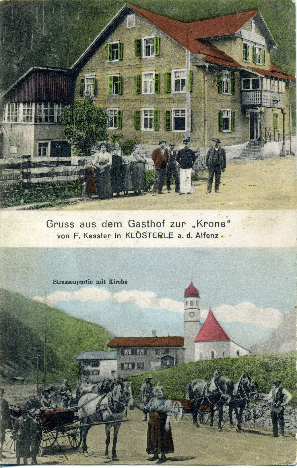 Im Bayerischen Kataster von 1808 ist das Gebäude als Doppelhaus ausgewiesen, das der Familie Berthold gehörte. In der Urmappe von 1857 sind immer noch zwei Gebäude eingezeichnet, die sich beide im Besitz von Hieronymus Strolz befanden. Der östliche Teil ist dabei als Wirtshaus ausgewiesen. Einige Jahrzehnte später erwarben Ferdinand und Benedikta Burtscher die „Krone“ samt der großen Landwirtschaft. Als Veteran des Sardinischen Kriegs von 1859 hatte Burtscher den Posten als Straßenmeister im Klostertal erhalten. Heute befindet sich der Gasthof in vierter Generation im Familienbesitz.