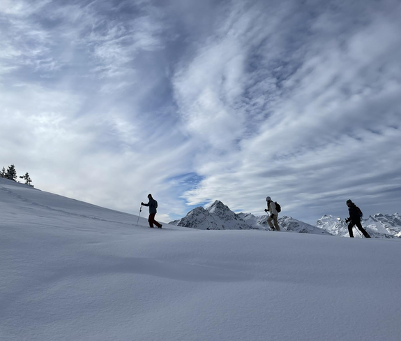 With snowshoes on the Muttjöchle: From the Muttjöchle, you can look forward to far-reaching views of the Klostertal, the Arlberg and the Rätikon. If you wish, you can stop off at the Muttjöchle panorama restaurant after the hike.