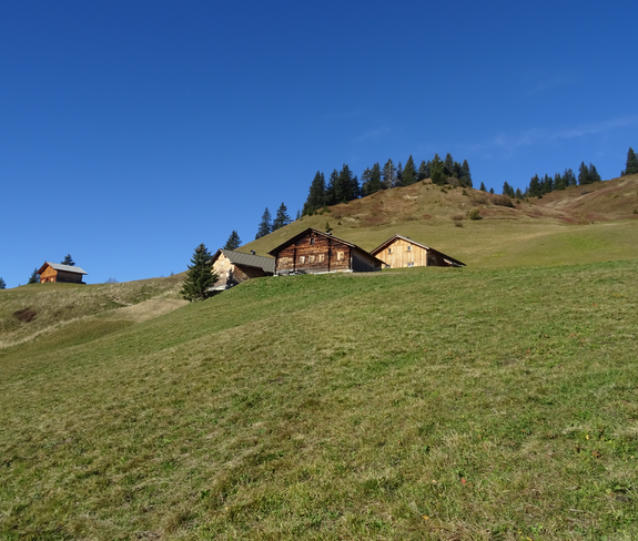 Parkplatz in Faschina - Güterweg - Bartholomäus Alpe - Wanderweg - Grätle - Hubertuskapelle - Gipfel des Zafernhorns - Hubertuskapelle - Zafern Maisäß - Fußweg/Schotterstraße - Parkplatz in Faschina